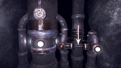 Cliquez sur le bouton blanc pour vous équiper de la combinaison et plonger. Actionnez le premier levier (photo ci-dessous à gauche). Vous fermez une vanne (photo ci-dessous à droite).