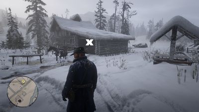 Suivez Charles, vous retournez au camp. Attachez votre cheval (photo ci-dessous à gauche), récupérez la biche sur votre épaule et emmenez-la à Pearson (photo ci-dessous à droite).