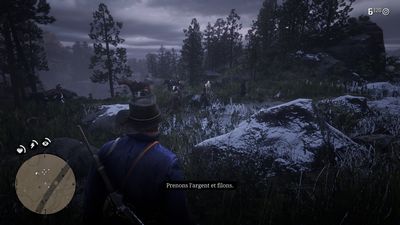 Suivez Dutch avec votre cheval (photo ci-dessous à gauche). Vous rencontrez Micah, continuez de suivre Dutch et Micah. Placez-vous à hauteur de Micah, vous pourrez lui parler si besoin.