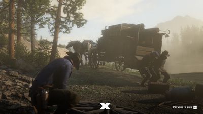 Approchez-vous du poteau quand on vous le demande puis attachez votre cheval (photo ci-dessous à gauche). La touche s'affiche à l'écran pour le faire. Suivez Dutch puis planquez-vous à