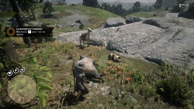 entendez des coups de feu en bas. Remontez sur votre cheval et rejoignez Hamish. Malheureusement le sanglier a eu raison d'Hamish ! Tuez le sanglier (photo ci-dessous à droite).