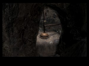 Si vous n'avez pas accès à la salle, Retournez en haut du rocher puis actionnez encore l'interrupteur pour faire tourner la salle... Allez en face pour entrer dans une nouvelle grotte, vous arrivez à un levier (photo ci-dessus à droite). Actionnez le levier, il permet de mettre en route la machine qui est située à gauche de votre prison du début du jeu. Faites demi-tour puis arrêter vous à l'entrée de la salle. Vous voyez une poignée sur le mur de gauche et un bouton sur le mur de droite. Actionnez la poignée à gauche puis actionnez 2 fois le bouton. Entrez dans la salle puis sortez par l'accès qui vient de s'ouvrir. Vous arrivez face à une porte vérouillée. Retournez-vous vous disposez de nouveau d'une nouvelle poignée, actionnez-là puis activez 2 fois encore le bouton à droite de votre position. Vous revenez au point de départ et vous faites face au pont suspendu. Rappuyez 3 fois sur le bouton du mur afin de faire pivoter une nouvelle fois la salle. Entrez de nouveau, vous vous retrouvez face à un dôme (photo ci-dessous).