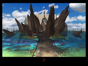 Actionnez le levier sur la gauche. Une maison apparait en face de vous, c'est un ascenceur. Prenez-le. Sortez de l'ascenceur puis allez toujours tout droit, vous voyez un moine s'échapper à gauche. Il s'échappe en navette. Appuyez sur l'interrupteur bleu pour faire revenir la navette, malheureusement, le moine s'est déjà échappé. Revenez sur vos pas puis tournez à gauche pour monter les grands escaliers, vous arrivez à un fauteuil (photo ci-dessous à gauche).