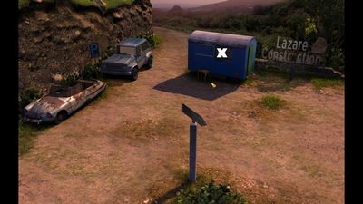 Examinez la statue et posez le niveau à bulle sur le bras droit de cette dernière (photo ci-dessous à gauche). Utilisez le couteau de poche sur le faux rocher à côté des lettres de Lazare Construction