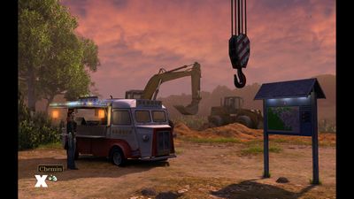 Parlez au géomètre et épuisez tous les dialogues avec lui (photo ci-dessous à gauche). Cliquez sur le chemin pour rejoindre la camionnette (photo ci-dessous à droite).