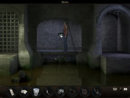 Vous arrivez sur l'île où se trouve Morangie. Il est bloqué dans le puits (photo ci-dessous à gauche). Ramassez l'épée