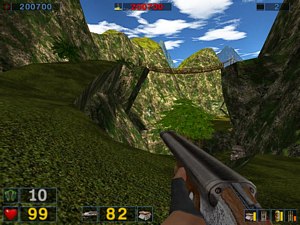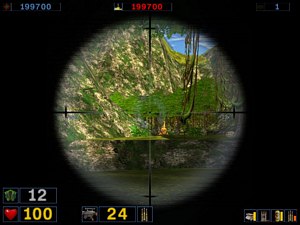 Montez ensuite en longeant la falaise sur votre droite (photo ci-dessus à droite). Vous rejoignez le pont suspendu. Traversez-le rapidement puis utilisez le fusil à lunette pour vous débarrassez du Reptiloïde d'Aludran qui vous lance les boules d'énergie verte (photo ci-dessous à gauche).