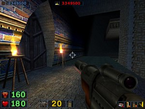 Passez la porte d'en face, prenez votre élan pour sauter par-dessus le vide un peu plus loin, vous rejoignez le couloir suivant (photo ci-dessus à droite). Allez au bout du couloir, passez la porte à droite, vous arrivez à un palais (photo ci-dessous à gauche).