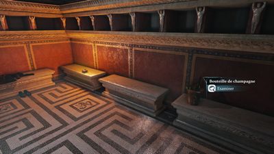 Entrez du côté de l'Apodyterium et le Sudatorium. Dans la première pièce, examinez les vêtements sur les différents bancs (photo ci-dessous à gauche). Examinez le seau à champagne (photo ci-dessous à droite).