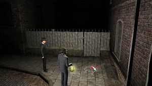 ci-dessous). Utilisez l'arrosoir sur le baril pour récupérer l'eau puis retournez parler à Sherlock Holmes équipé de l'arrosoir rempli d'eau. Vous repassez sur Sherlock Holmes.