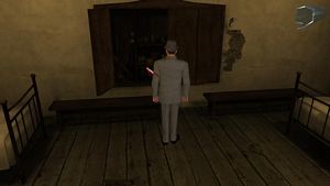 pour la pension miteuse. Epuisez les dialogues avec Finley. Montez l'escalier sur la gauche de quelques marches puis ramassez la bouteille en verre cassée (photo ci-dessous à gauche). Reparlez à