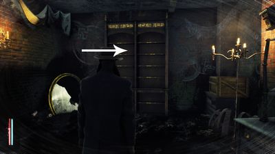Retournez au rez-de-chaussée et passez à travers le portail qui vient d'apparaître (photo ci-dessous). La première scène est à côté de la faille, la 2ème est le groupe d'homme qui jette le corps en bas et la