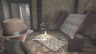Allez à l'étage et cliquez sur le carnet sur le bureau (photo ci-dessous à gauche). Approchez-vous des caisses suivantes (photo ci-dessous à droite) puis utilisez "l'oeil de l'esprit" dessus.
