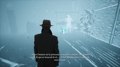 Allez à l'étage et utilisez "l'oeil de l'esprit", attendez que le symbole se fige et le mur disparait (photo ci-dessous à gauche). Cliquez sur la note sur le sol (photo ci-dessous à droite).