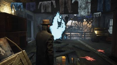 Cassez les planches qui bloquent la porte et entrez. Examinez le cadavre puis prenez une photo (photo ci-dessous à gauche). Utilisez "l'oeil de l'esprit" sur le bracelet sur la table de la cuisine pour voir la