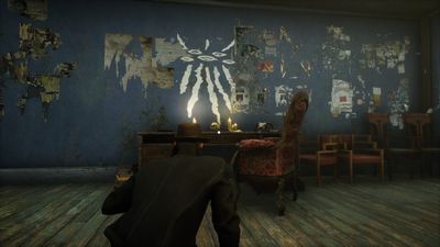 Approchez-vous de la marque au mur (photo ci-dessous à gauche) puis utilisez "l'oeil de l'esprit" dessus. Soyez suffisamment près pour que les symboles se forment en un seul. Vous découvrez 3 cadavres (photo