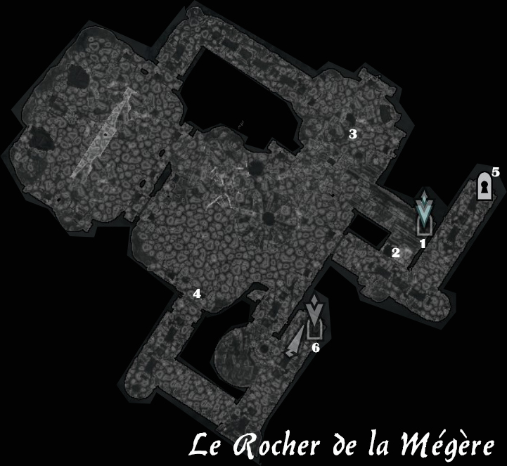 Passez par le point 3 pour sortir des ruines. Montez les escaliers pour rejoindre le Rocher de la Mégère. Récupérez la statue de Dibella au point 4, elle est nécessaire à la quête "Retrouver la Statue de Dibella