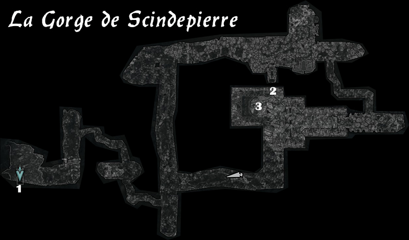 Lorsque vous prenez le coffre en 2 les murs en 3 et 4 vont s'ouvrir. Vous serez attaqué par des falmers. Suivez le cours d'eau dans le gouffre pour avancer. Le fantôme disparaît en vous approchant au point 9, récupérez le calepin abîmé