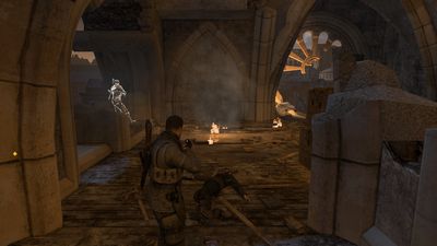 Entrez à gauche dans les ruines puis allez à l'étage rejoindre l'endroit suivant (photo ci-dessous). Sprinter pour traverser la rue.