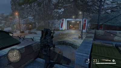 Allez tout en haut et ressortez pile en face du 1er canon (photo ci-dessous à gauche). Pour info, vous avez plusieurs charges de C4 au 1er étage du bunker si besoin. Partez à droite du canon,