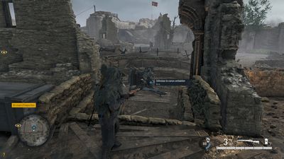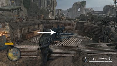 Rejoignez les tranchées (photo ci-dessous à gauche) puis détruisez le 1er canon (photo ci-dessous au milieu). Prenez la tranchée de gauche et allez tout droit, vous arriverez au 2ème canon (photo ci-dessous à droite).