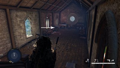 Il faut rejoindre la fenêtre en hauteur, pour cela grimpez à la gouttière à proximité (photo ci-dessous à gauche). Le pilote est dans une des pièces en hauteur à l'intérieur de l'église (photo ci-dessous à droite).