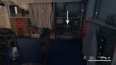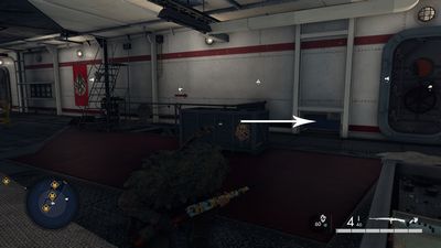 Vous trouverez l'armurerie au même niveau si vous voulez la saboter. Remontez tout en haut du porte-avions (photo ci-dessous à gauche). Cliquez sur la console dans la cabine de pilotage (photo ci-dessous à droite).