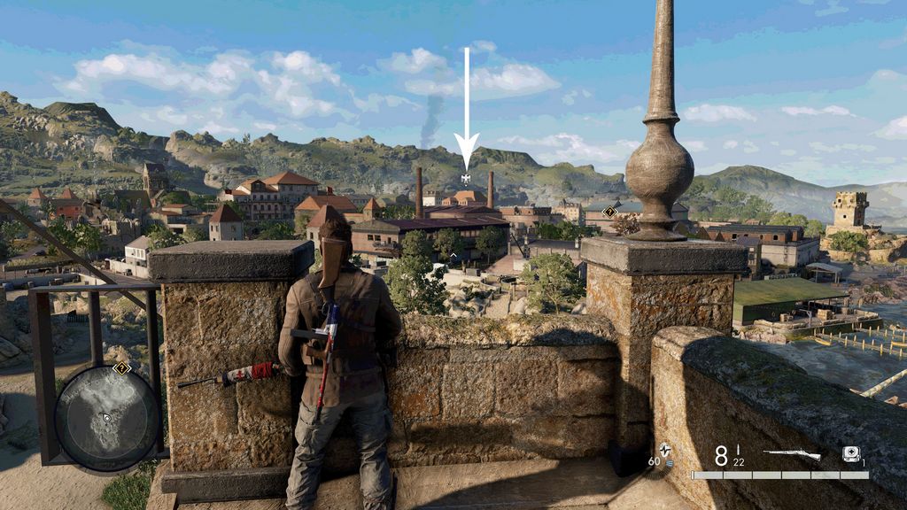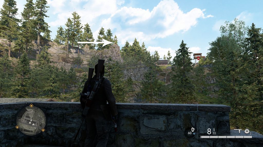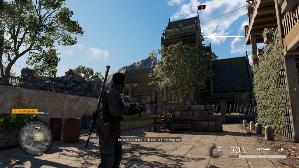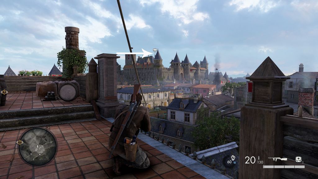 = > La troisième statue se trouve à l'endroit suivant (photo ci-dessous). Au tout début de la mission, vous sortez du bois et c'est l'immence bâtiment sur la gauche. L'aigle est sur le toit.