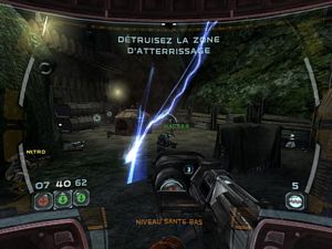 Utilisez ensuite la mitrailleuse lourde pour vous protégez lorsque les ennemis vont arriver. Avancez dans la jungle, vous arriverez à une capsule d'ennemis (photo ci-dessus à droite). Détruisez-là puis allez en face. Vous arrivez à un champ de force (photo ci-dessous à gauche).
