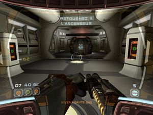 Avancez dans les couloirs. Hackez l'ordinateur un peu plus loin puis rejoignez les couloirs qui descendent (photo ci-dessus à droite). Descendez tout en bas puis tournez à gauche, vous arrivez dans le hangard d'un vaisseau spatial (photo ci-dessous).