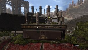 Allez jusqu'aux tuyaux derrière Kurk (photo ci-dessous à gauche), c'est une chaudière. Ouvrez le 1er tuyau au partant de la gauche puis ramassez la résine jaune et bleue. Ouvrez le 3ème tuyau en partant de la gauche