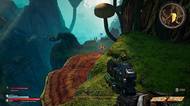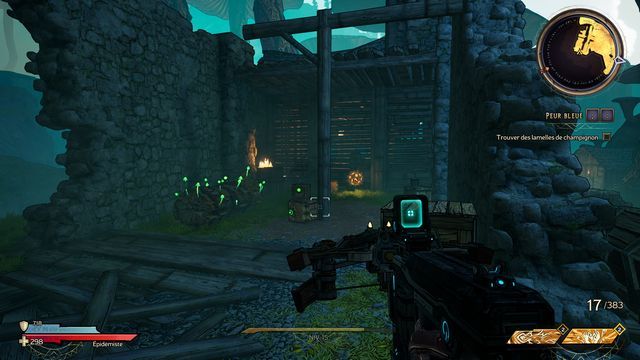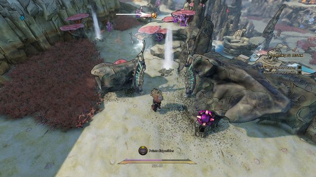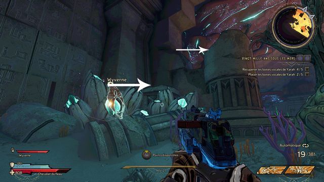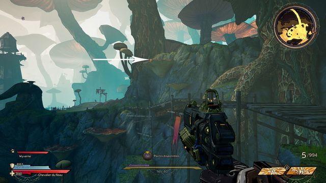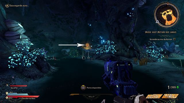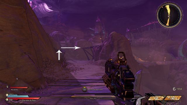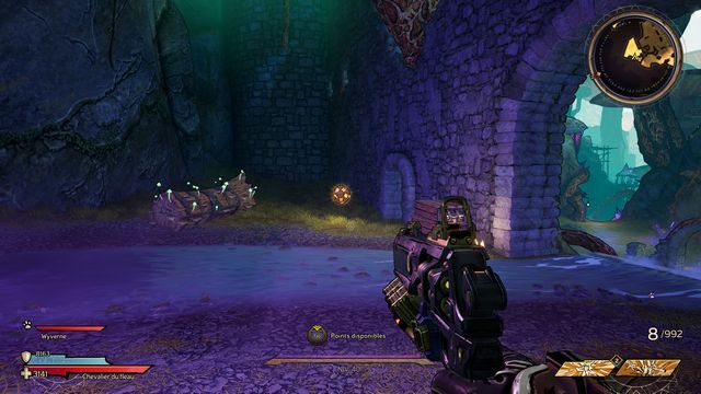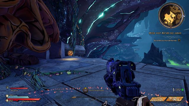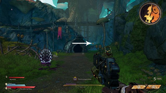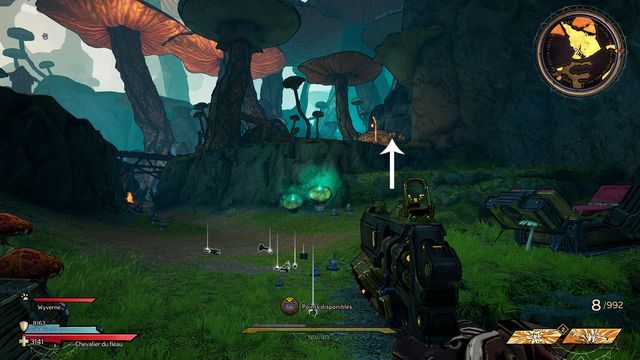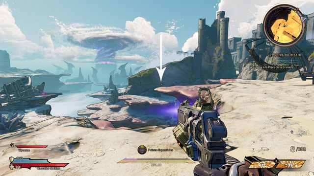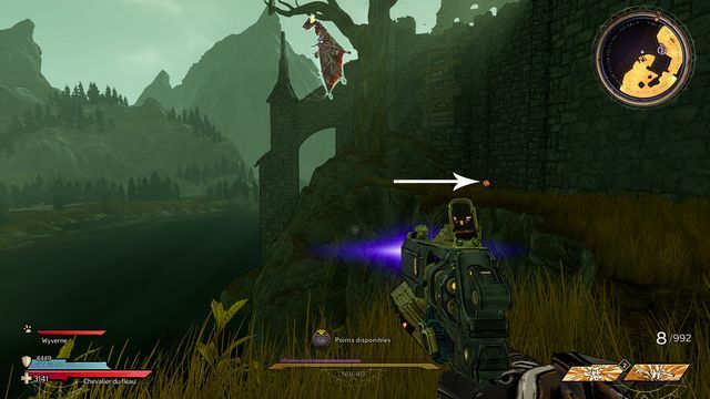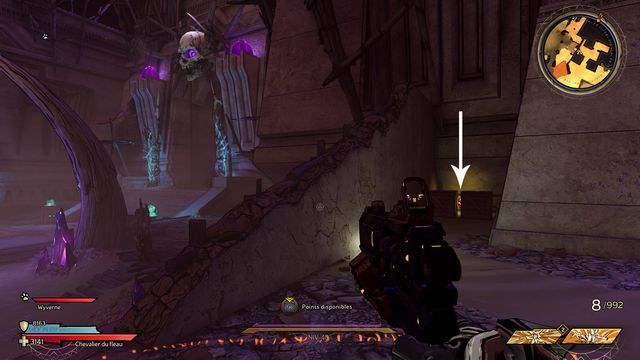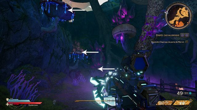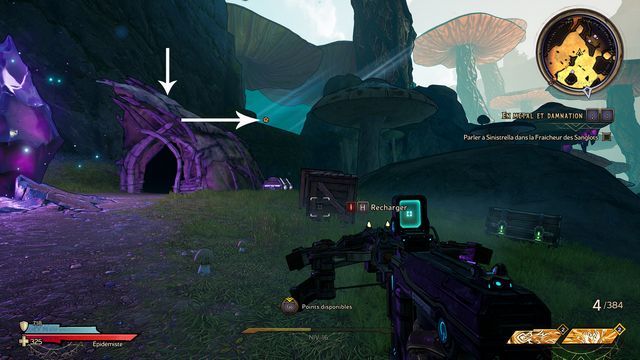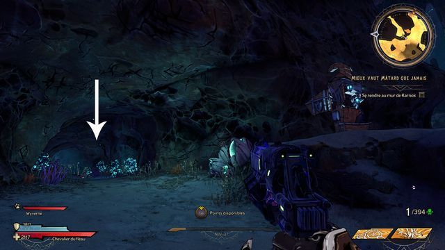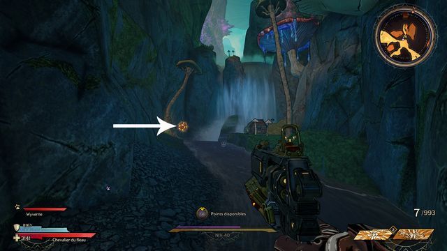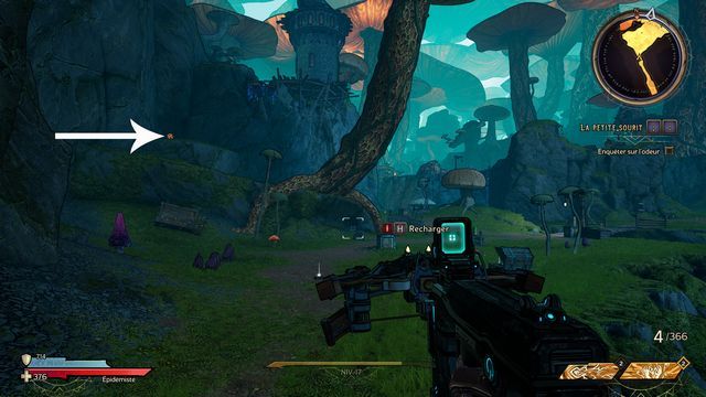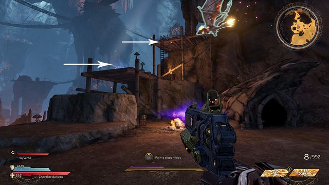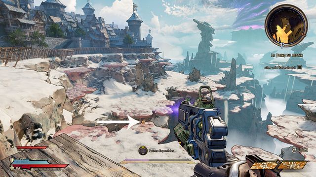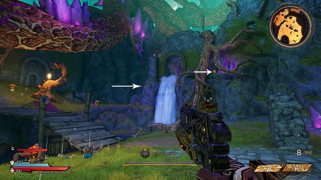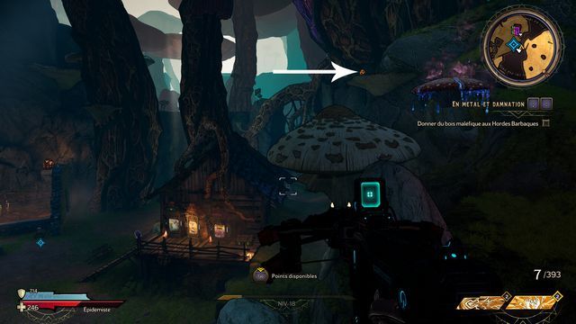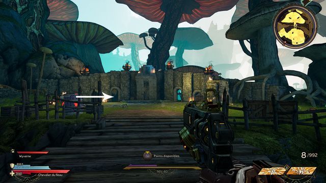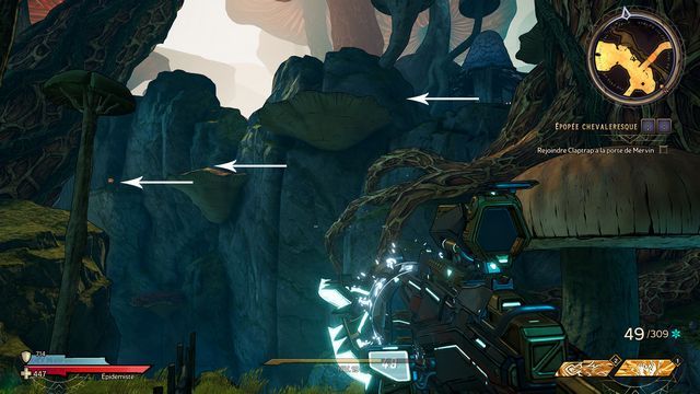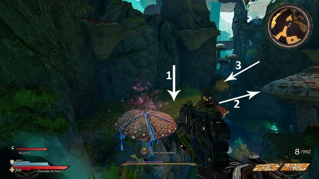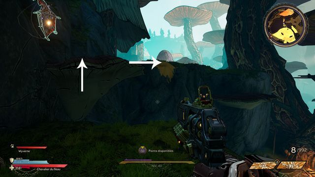 Rejoignez la muraille (photo ci-dessous à gauche), passez sous l'arcane de gauche puis sautez sur le champignon et sur la marque jaune sur le rocher (photo ci-dessous à droite).