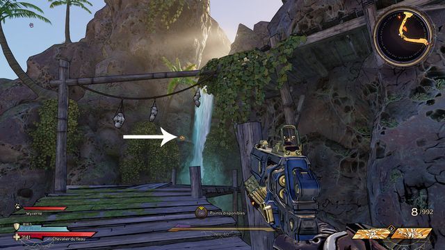 19. A l'endroit suivant (photos ci-dessous). Vous glissez sur l'eau et vous arrivez au bateau pirate. Retournez-vous, le dé est derrière la cascade d'où vous arrivez.