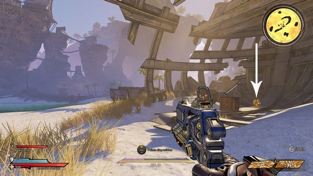 17. A l'endroit suivant (photos ci-dessous). Tirez sur l'ancre en hauteur. Elle va tomber et casser les planches au sol. Le dé est dans le trou.