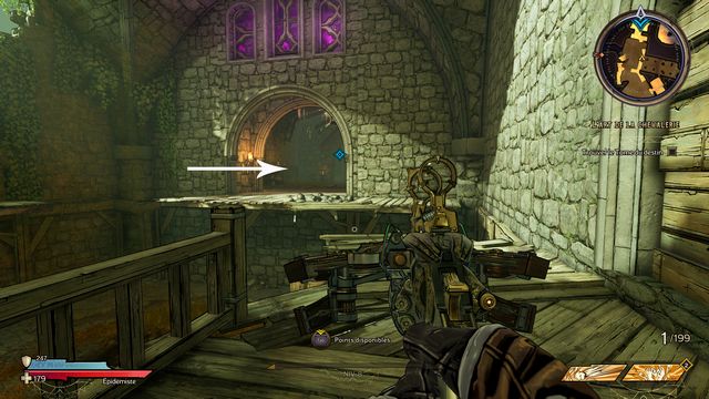 Entrez dans la nef et passez par le trou dans la muraille (photo ci-dessous).