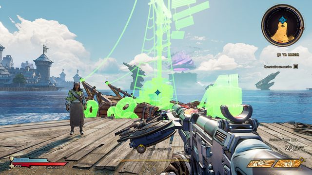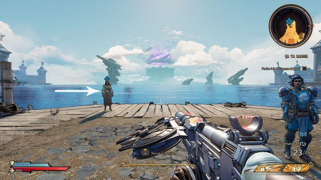 Accroupissez-vous quand "Mike le paladin" vous le demande. Parlez ensuite à la maîtresse du port à proximité (photo ci-dessous à gauche). La maîtresse du port invoque un navire (photo ci-dessous à droite), cliquez