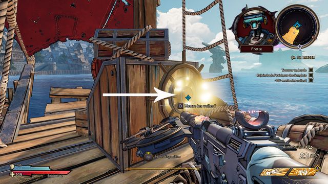 Sautez sur le bateau et cliquez sur la proue pour partir (photo ci-dessous). Vous coulez ! ok, il faut vraiment trouver un barde :)