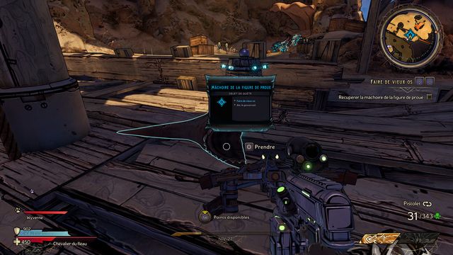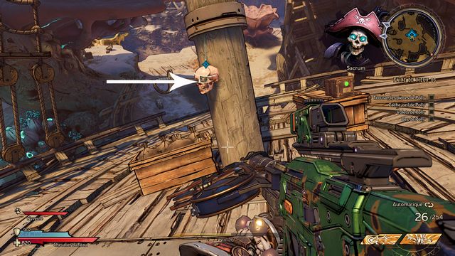 Remontez et cliquez sur le drapeau pour le placer sur le mât (photo ci-dessous à gauche). Tuez le squelette qui apparaît et récupérez "La Mâchoire de la Figure de Proue" (photo ci-dessous à droite).