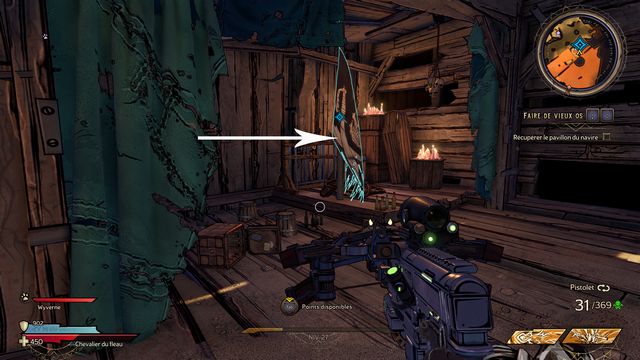 Allez le placer sur son emplacement (photo ci-dessous à gauche). Tuez le maître d'équipage qui arrive puis récupérez le pavillon dans la soute (photo ci-dessous à droite).
