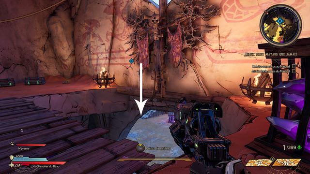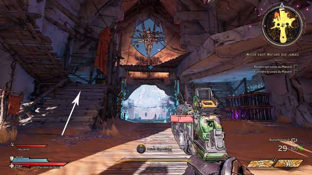 Le passage est à l'étage, vous trouverez sur la route les 3 distributeurs d'armes et munitions. Laissez-vous tomber en contrebas pour rejoindre l'arène (photo ci-dessous à gauche).