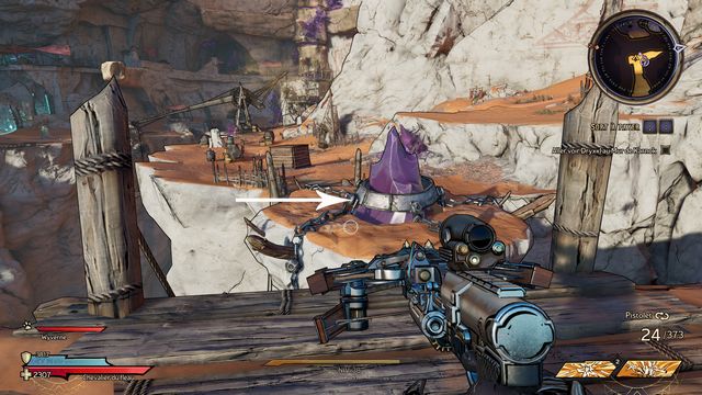 Vous pouvez désormais traverser le ravin. Vous rejoignez un pont cassé, tirez sur le quartz quand Mâtard vous le demande (photo ci-dessous à gauche). La plateforme descend, vous pouvez alors sauter dessus pour