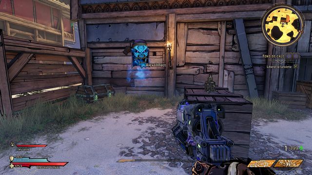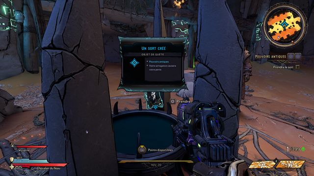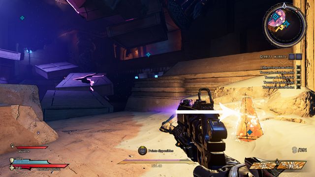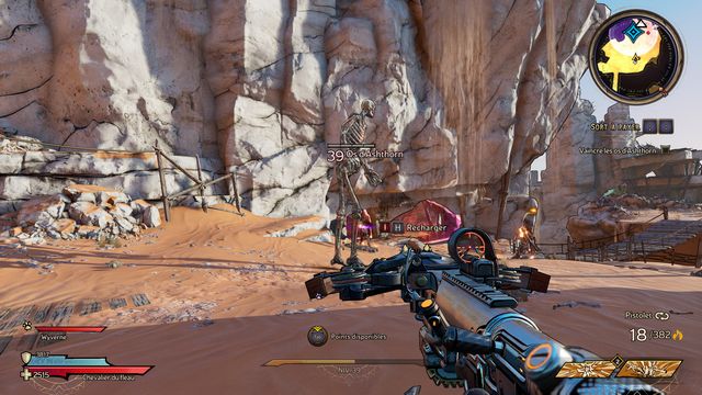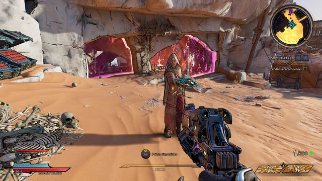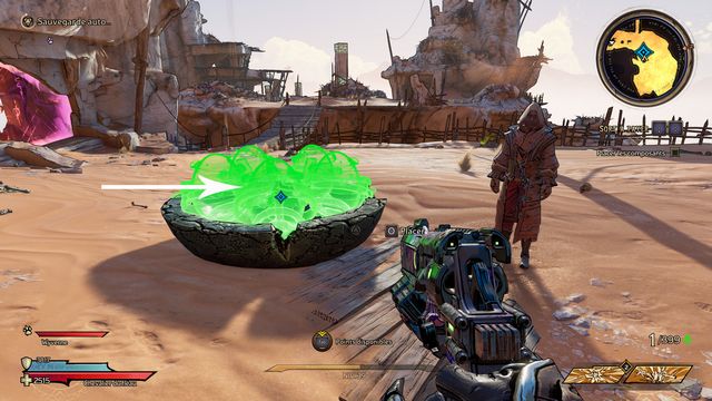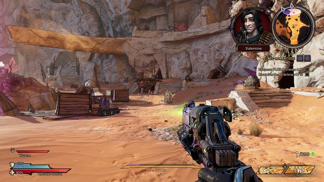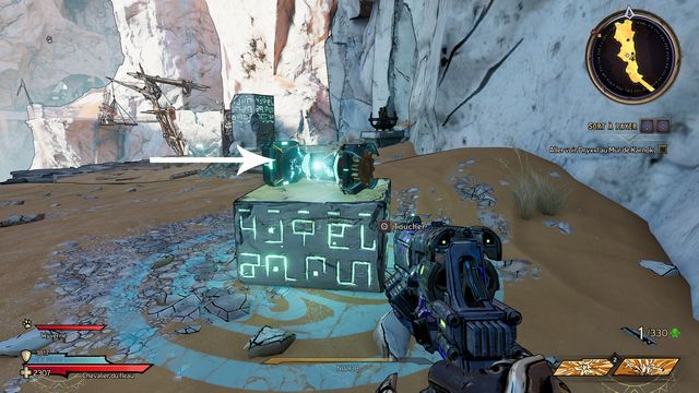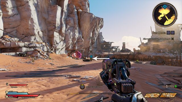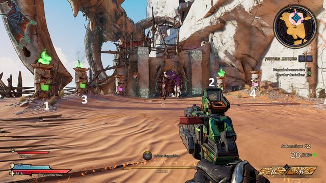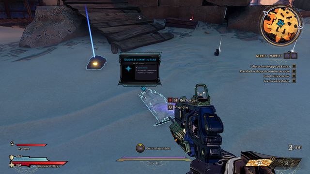Il ressort quelques secondes plus tard. Préparez-vous au combat ! Une fois la zone sécurisée, rejoignez Claptrap qui est bloqué dans le sable (photo ci-dessous à gauche) et donnez-lui un coup pour l'aider à en