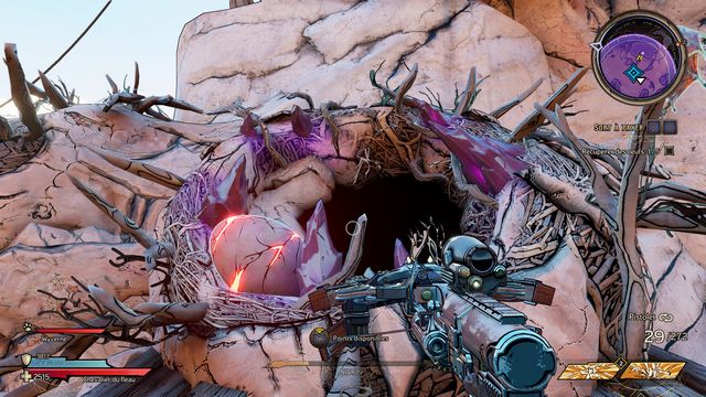 Tuez-les et récupérez les oeufs dans les différents nids de la zone (photo ci-dessous à gauche). Sautez sur la plateforme et tirez sur le quartz violet sous la plateforme pour accéder à la plateforme plus haute
