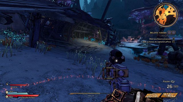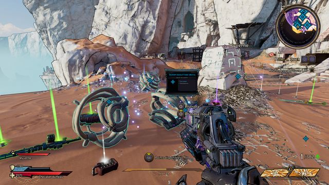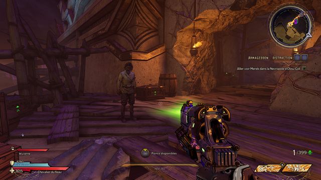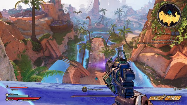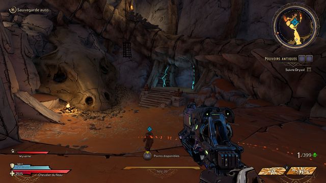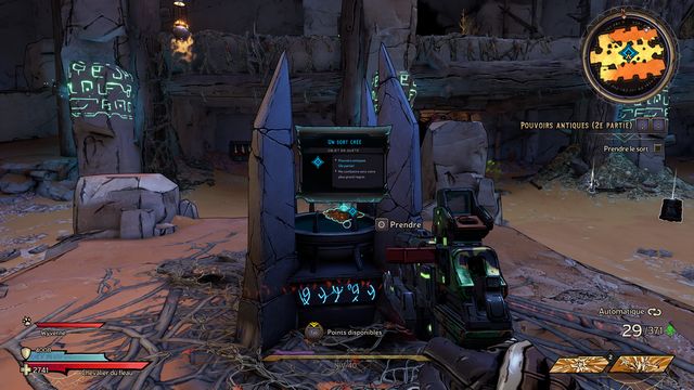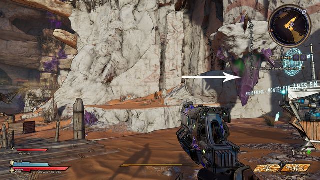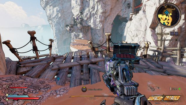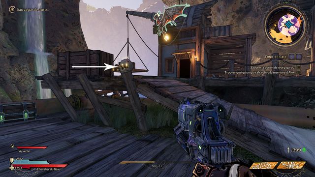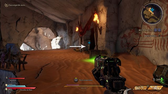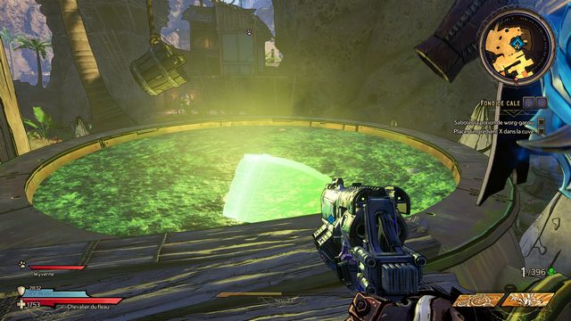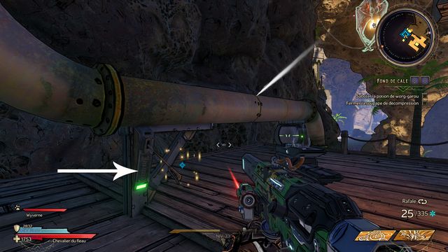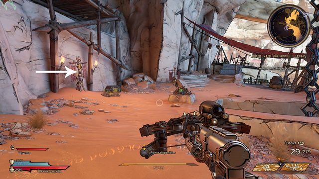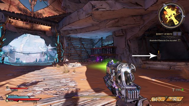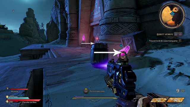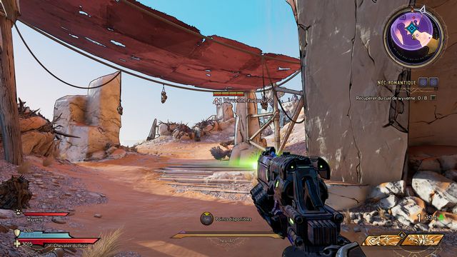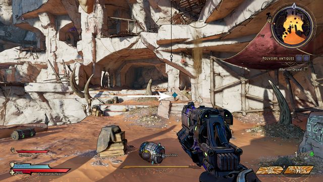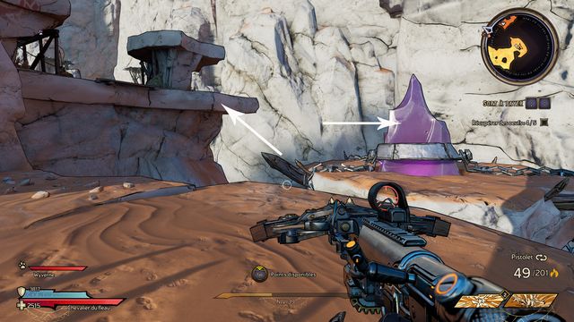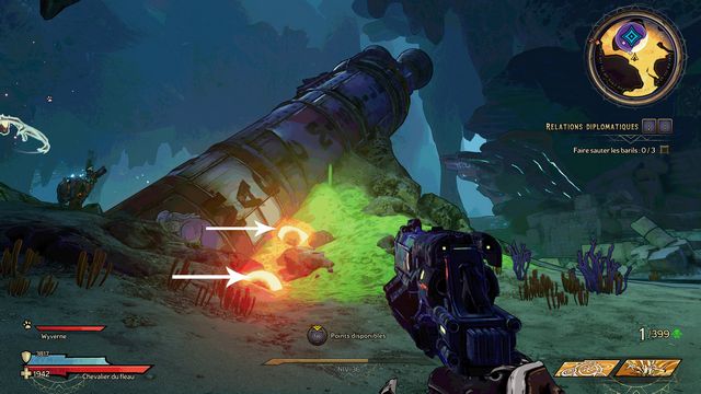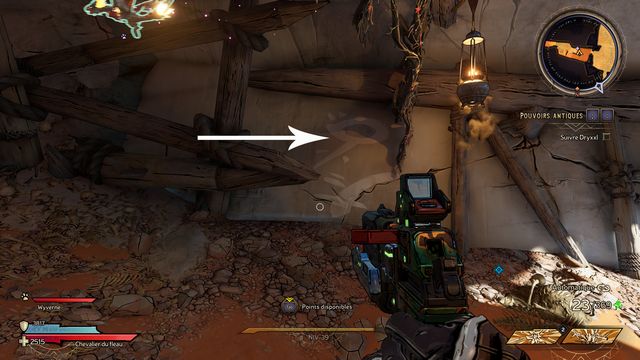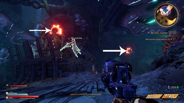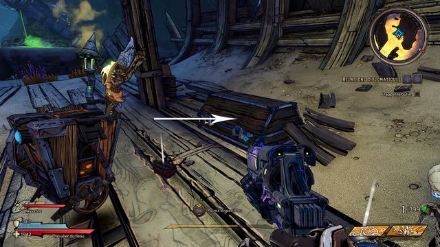 Tuez toutes les nagas qui vous attaquent puis parlez, de nouveau, à Qimble. Suivez Claptrap. Tirez sur les barils (photo ci-dessous à gauche). Rejoignez Claptrap à proximité des 3 nagas (photo ci-dessous à droite).
