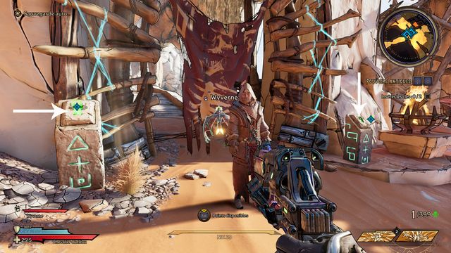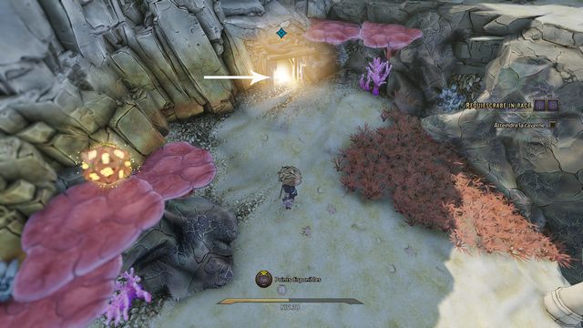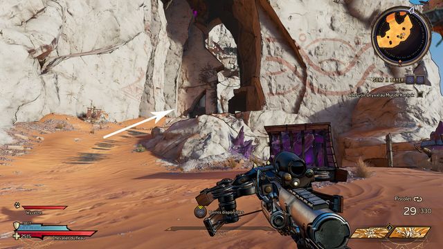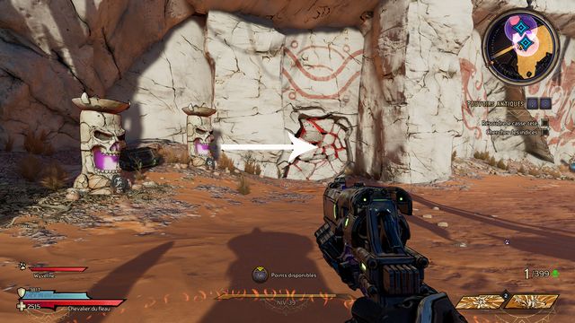Suivez Dryxxl. Tirez sur le mur craquelé (photo ci-dessous à gauche), vous trouvez une grotte. Regardez les motifs sur les murs (photo ci-dessous à droite).
