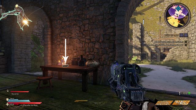 Donnez un coup dans les planches pour ouvrir le passage (photo ci-dessous à gauche). Récupérez "Le Livre de Recettes de Potions" sous les arcades de gauche en entrant dans la zone (photo ci-dessous à droite).
