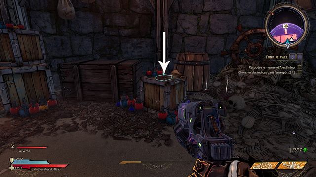 Tuez les 2 pirates qui se transforment en requin puis récupérez le chapeau d'Alex sur les caisses (photo ci-dessous à gauche). Nettoyez la zone d'après puis cliquez sur le crâne (photo ci-dessous à droite).