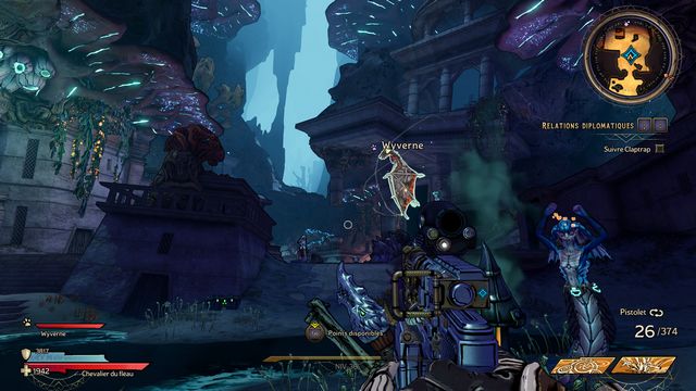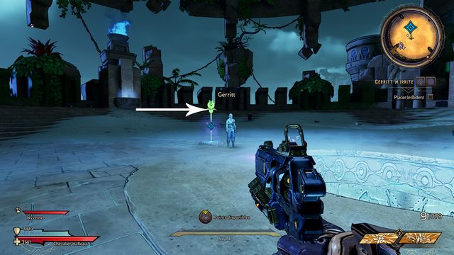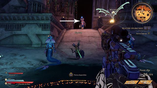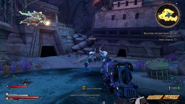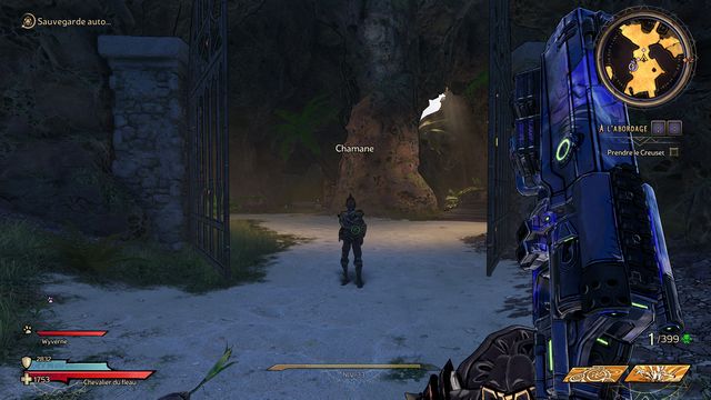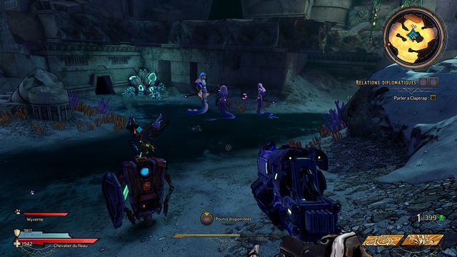 Frappez ensuite le coffre derrière Claptrap (photo ci-dessous à gauche). Rejoignez les 2 nagas, Ezin et Deuter un peu plus loin (photo ci-dessous à droite) et parlez à Claptrap.