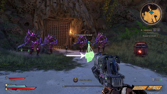 Approchez-vous des pirates pour commencer les pourparlers avec "Mini Cullis" puis cliquez sur le creuset (photo ci-dessous à gauche). Une fois les crabes morts, cliquez sur le crâne (photo ci-dessous à droite)