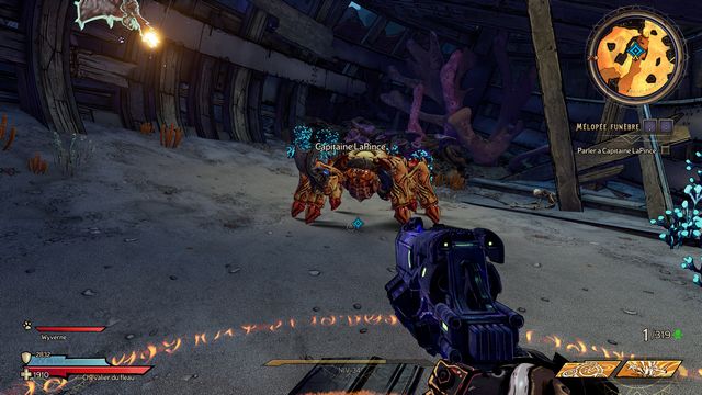 Après avoir décimé la 1ère vague d'ennemis, retournez au bateau (photo ci-dessous à gauche). Tuez tous les crabes, le "Capitaine Lapince" apparaît (photo ci-dessous à droite).